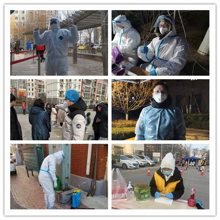 行政教工党支部书记于雪娇身处津南疫情防控重点领域,多次参加到宝业馨苑社区进行志愿服务,配合完成信息采集、通告张贴、秩序维护等志愿服务工作。虽然穿上防护服后时常面临10几个小时不能吃饭、不能喝水、不能上厕所的窘境,但是在志愿者队伍中没有一个人抱怨,大批的志愿者相互并不认识,但他们都有一个共同的名字,叫共产党员。她说:“津南区是疫情防控的重中之重,核酸检测工作的时间紧、任务重,作为一名党员要积极响应,配合社区抢占防疫先机,用实际行动践行共产党员的初心和使命。”
