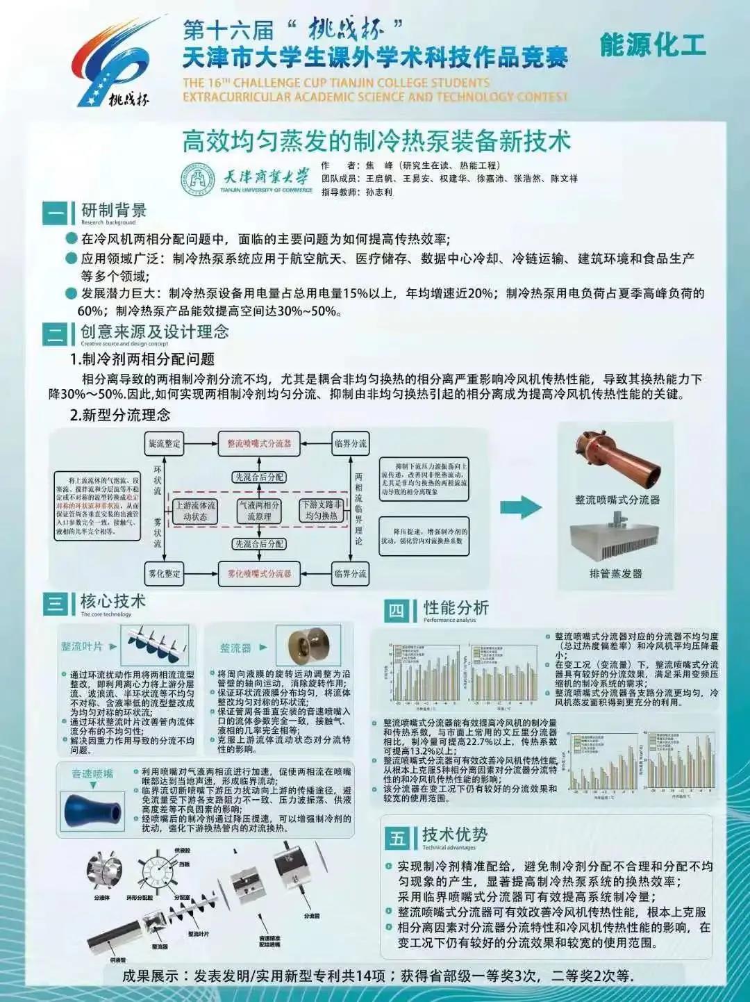 由我院孙志利老师指导的,焦峰、王启帆、王易安、权建华、徐嘉沛、张浩然和陈文祥同学的科技发明制作B类《高效均匀蒸发的制冷热泵装备新技术》作品斩获第十六届“挑战杯”全国大学生课外学术科技作品竞赛市赛特等奖,并拟推荐申报国赛!(审稿:张建东)
