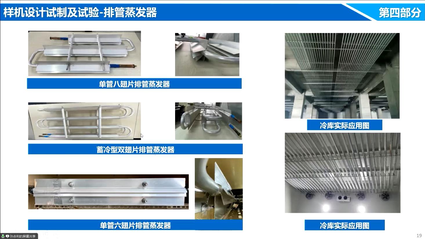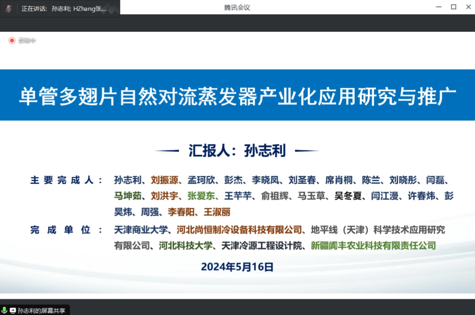 的项目完成人员为:孙志利、刘圣春、李晓凤、席肖桐、陈兰、刘晓彤、吴冬夏。孙志利教授作为项目负责人进行了工作汇报,详细介绍了单管多翅片自然对流排管蒸发器的研制背景、开发历程、社会意义、关键技术、成果、样机制作和应用推广。