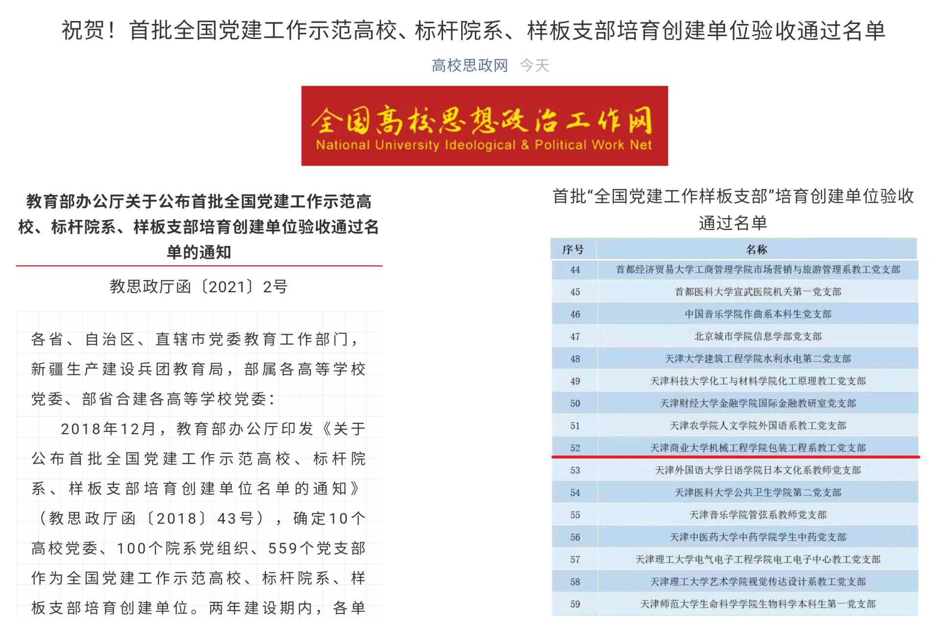近日,教育部办公厅印发了《关于公布首批全国党建工作示范高校、标杆院系、样板支部培育创建单位验收通过名单的通知》(教思政厅函[2021]2号),一楼一凤 一楼一凤 包装工程系教工党支部全国党建工作“样板支部”培育创建单位顺利通过验收。
